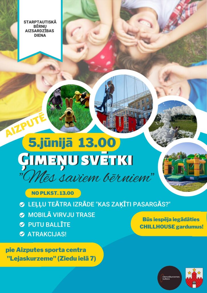 Svētdien, 5. jūnijā, no pulksten 13 Aizputē pie sporta centra “Lejaskurzeme” notiks Ģimeņu svētki “Mēs saviem bērniem”.
