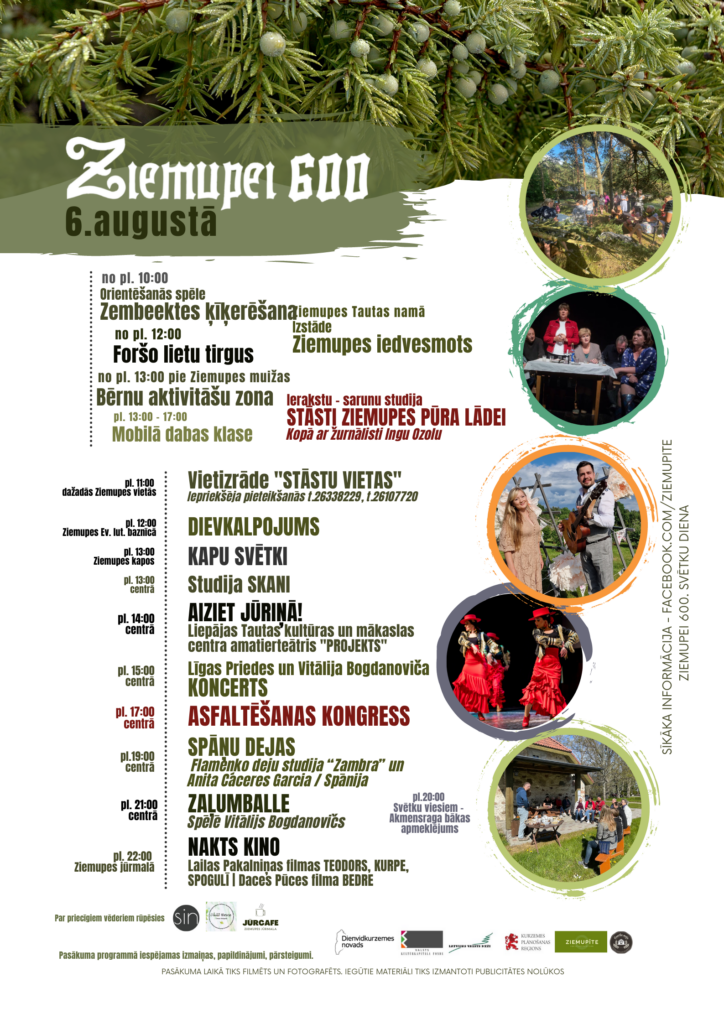 Vakara noslēgumā Spāņu dejas, Zaļumballe centrā un brīvdabas kino Ziemupes jūrmalā. Kino repertuārā Lailas Pakalniņas filmas “Teodors”, “Kurpe”, “Spogulī”, Daces Pūces “Bedre”.