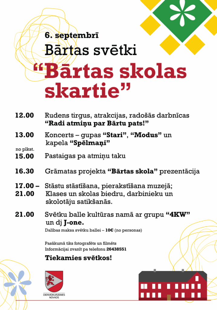 Sestdien, 6. septembrī, Dienvidkurzemes novada iedzīvotāji un viesi aicināti uz Bārtas svētkiem “Bārtas skolas skartie”, kas šogad noritēs Bārtas skolas ēkas simtgades zīmē un pulcēs skolas bijušos skolēnus, skolotājus, darbiniekus, kā arī ikvienu, kam Bārta tuva un mīļa.