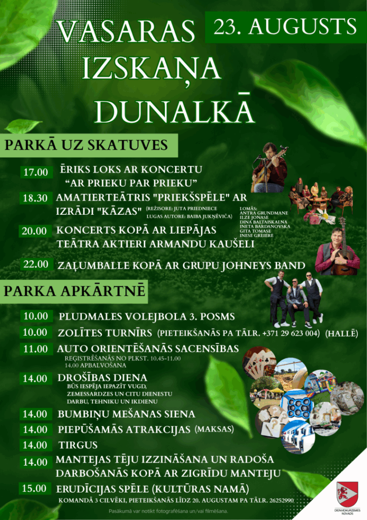 Sestdien, 23. augustā, no pulksten 10 Dunalkas parkā un tā apkārtnē norisināsies vasaras noslēguma svētki “Vasaras izskaņa Dunalkā”, kuros ikviens aicināts baudīt bagātīgu programmu visas dienas garumā.