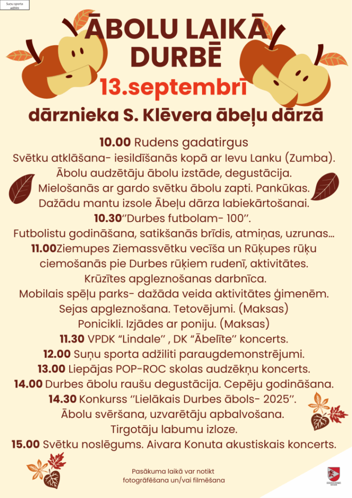 Sestdien, 13. septembrī, no pulksten 10 dārznieka Sīmaņa Klēvera ābeļu dārzā Durbē jau trīspadsmito reizi ikviens aicināts svinēt rudeni un ābolu ražas laiku pasākumā “Ābolu laiks Durbē”. Šī gada īpašais notikums – Durbes futbolam 100.