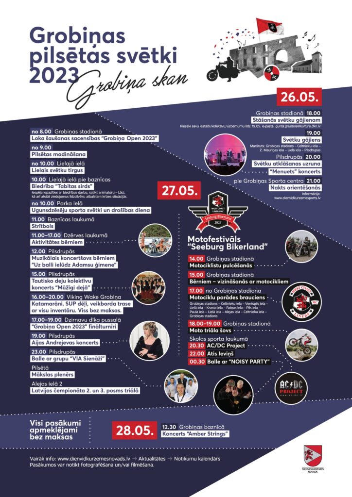 Turpinājumā būs dažādas aktivitātes un svētku sestdienas programma noslēgsies ar Aijas Andrejevas koncertu pilsdrupās, bet Zentas Mauriņas Grobiņas vidusskolas stadionā koncertēs “AC/DC project”, kam sekos balle abās vietās.
