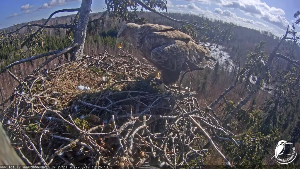 Durbē esošajā Jūras ērgļu ligzdā, kuras norises Latvijas Dabas fonds (LDF) translē videotiešraidē, piektdien ir izdēta šosezon otrā ola, novēroja LETA.