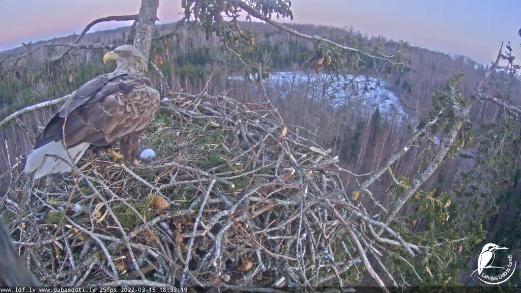 Durbē esošajā Jūras ērgļu ligzdā, kuras norises Latvijas Dabas fonds (LDF) translē videotiešraidē, otrdienas pēcpusdienā ir izdēta šosezon pirmā ola.