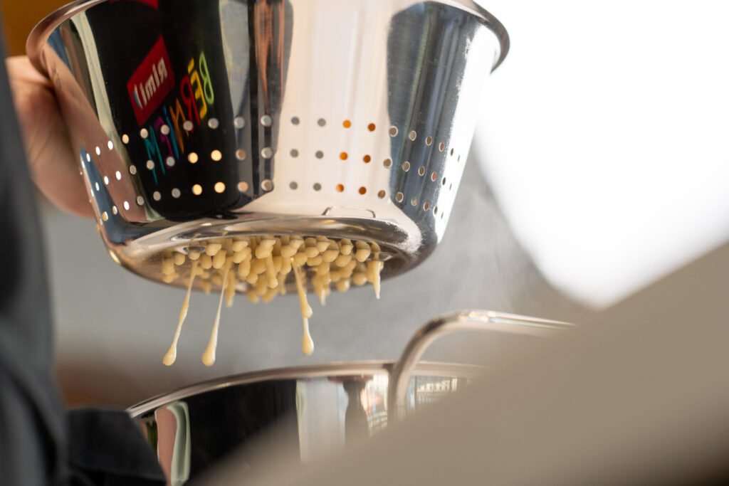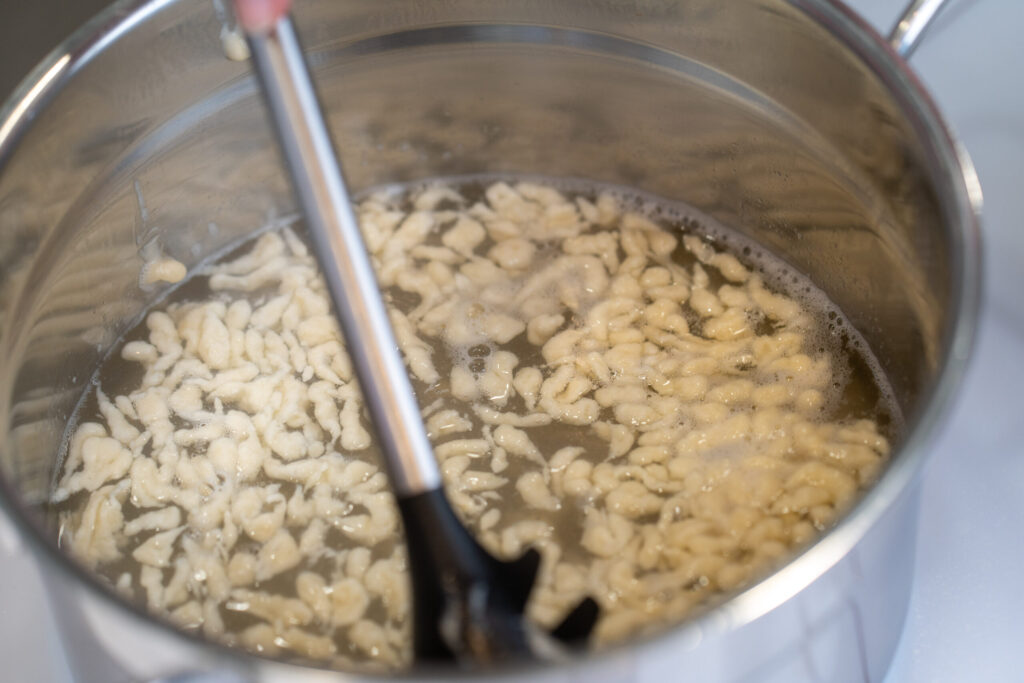 Maisot mīklu, klimpas caur caurduri pilina tieši rabarberu ķīselī vai verdošā ūdenī. Ja gatavo ūdenī, klimpas pievieno rabarberu zupai pēc tam.