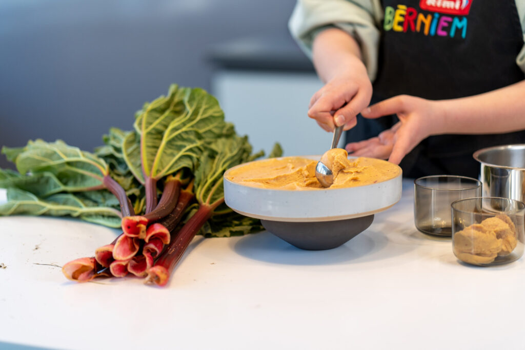 Teju katrā lauku mājā zaļo rabarberu krūms. Tā ir ne tikai krāšņa pagalma rota, bet arī vērtīgs vitamīnu avots, turklāt 100 gramu rabarberu satur vien 21 kaloriju, jo tā pamatu – 95% – veido ūdens. Rabarbers ir daudzgadīgs augs un var zaļot pat 10 līdz 15 gadus. Interesanti, ka sezonas laikā viens rabarbera krūms var saražot līdz 40 kg rabarberu. To, ka rabarberus var kraukšķināt tāpat, tikko rautus no dobes, šķiet, zina ikviens, bet no tiem var pagatavot arī lieliskus saldēdienus. Šoreiz “Rimi Bērniem” garšas eksperte Lība Smildziņa gatavo rabarberu saldējumu un rabarberu saldo zupu ar klimpām.