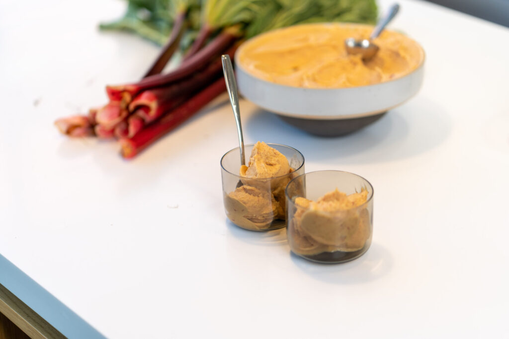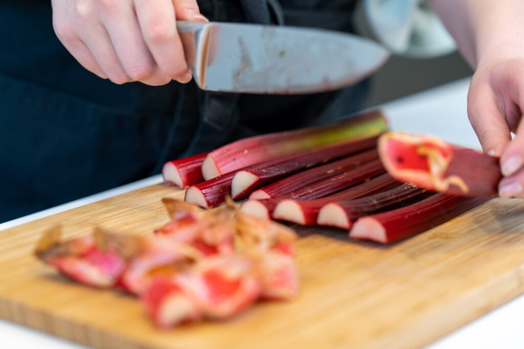 • 300 g rabarberu, iepriekš sasaldētu (saldē vismaz 3 stundas)