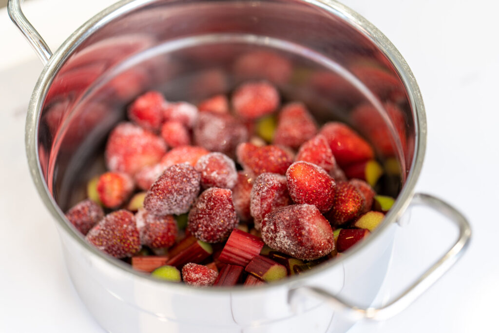 Rabarberus sagriež šķēlītēs un liek katlā kopā ar zemenēm, cukuru un ūdeni. Vāra aptuveni 6–10 minūtes, līdz viss savārījies.