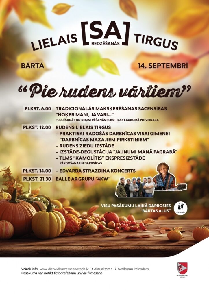 Sestdien, 14. septembrī, Bārtā norisināsies Lielais [Sa]redzēšanās tirgus “Pie rudens vārtiem”, kas ir kā Bārtas pagasta un novada ļaužu un viesu satikšanās vieta un kopā būšana, sagaidot bagātīgo zelta rudeni.