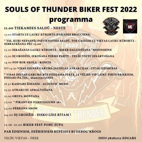 Liepājas motoklubs “Souls of Thunder Mcc” sestdien, 11. jūnijā, Kazdangas atpūtas vietā “Lauku kūrorts” jaudīgi rīkos savu pirmo festivālu “Souls of Thunder Biker Fest 2022”, kurā būs atrakcijas, mūzika un ballēšanās līdz rīta gaismai.