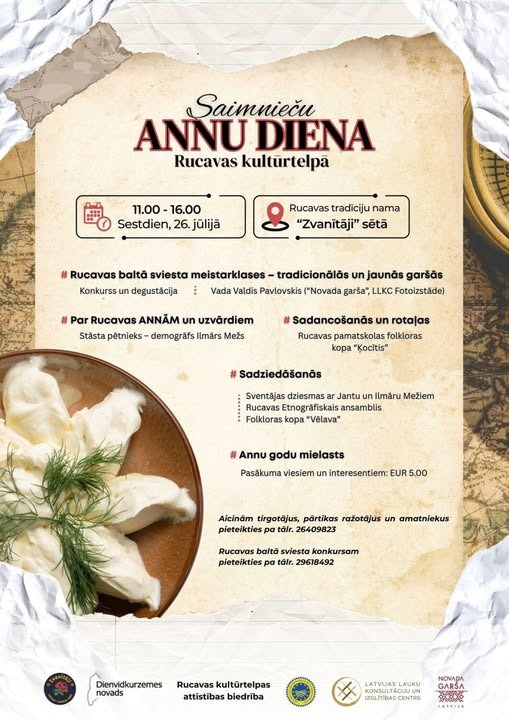 “Ieplāno ceļojumu uz Rucavas kultūrtelpu, lai kopā svinēt Annu – Saimnieču dienu, iepazītu un izbaudītu tradicionālos vasaras ēdienus, iepazītu Rucavas balto sviestu, dziedāt senās Sventājas dziesmas, rotaļās iet un dančus vest!” aicina biedrības “Rucavas tradīciju klubs” vadītāja Māra Tapiņa.