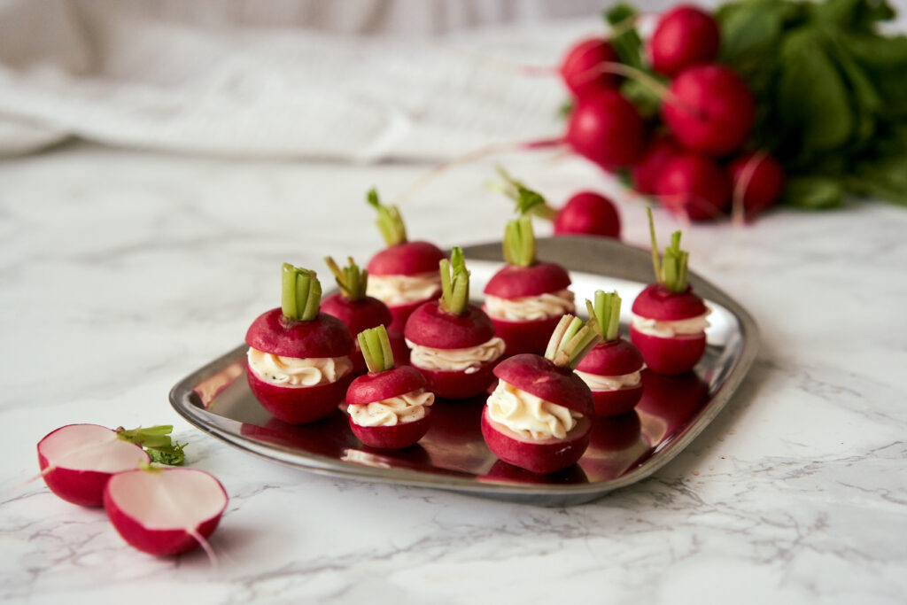 6) Sapildi maisījumu konditorejas maisā un izspied nedaudz krēma uz redīsu apakšējām pusītēm. Liec krēmam virsū redīsu lakstu pusītes. Novieto ledusskapī uz vismaz 30 minūtēm, lai krēms sacietē.