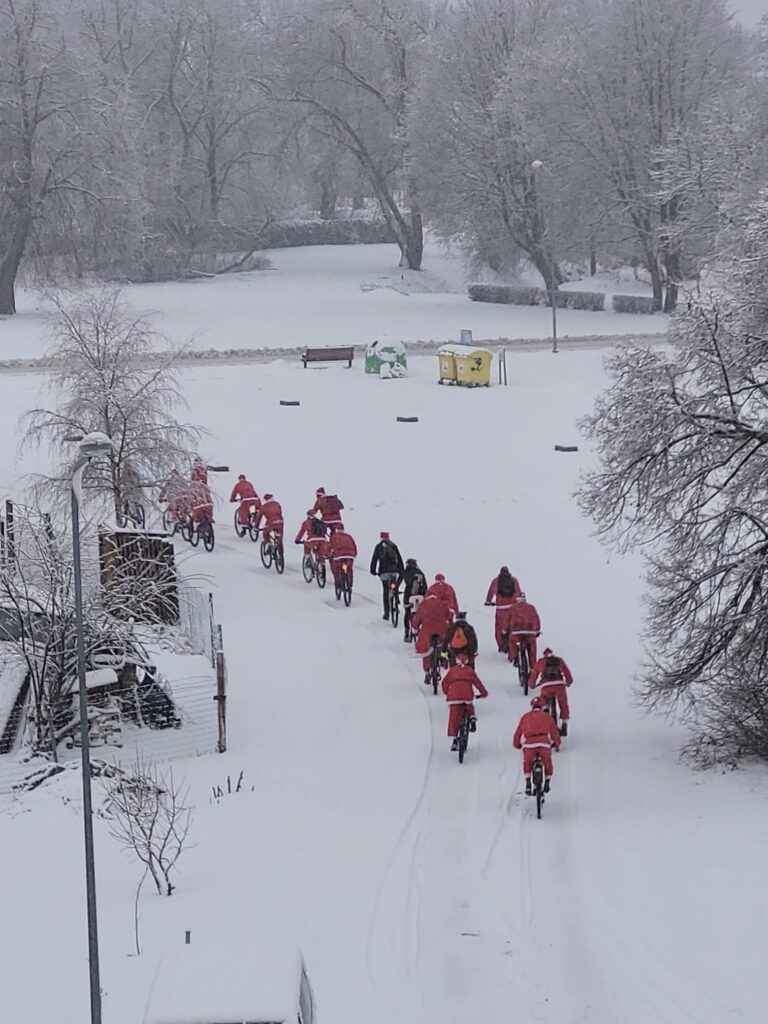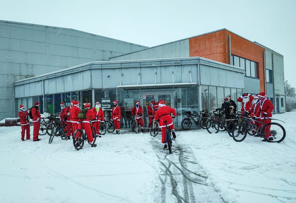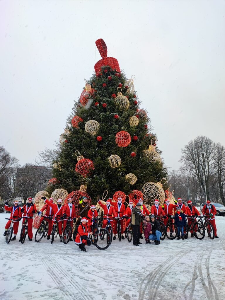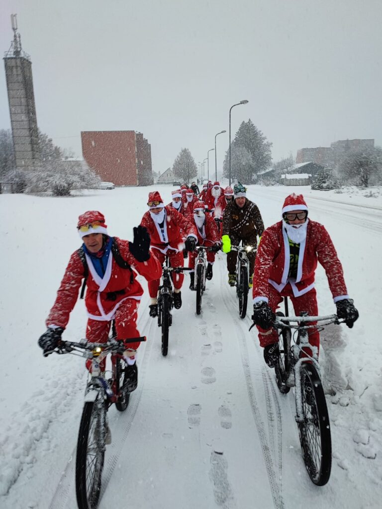 Piektdien, 24. decembrī, aptuveni 20 Ziemassvētku vecīši bija manāmi uz velosipēdiem, sniegotajā dienā braucot no Grobiņas uz Liepāju.