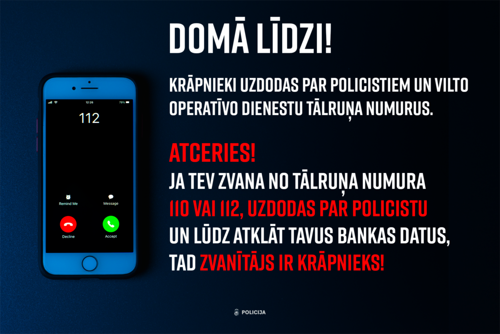 Valsts policijā šomēnes ir vērsušies daudzi iedzīvotāji, ziņojot, ka ir saņēmuši telefona zvanus no personām, kas runājušas krievu valodā, uzdevušās par policijas darbiniekiem un mēģinājušas izkrāpt personas datus un bankas kontu datus. Rīgas reģionā vien policijai ir ziņots par vairāk nekā 200 šādiem zvaniem, un iedzīvotājiem kopumā Rīgā un Pierīgā tādējādi izkrāpti 63 300 eiro. Taču daudz šādu krāpšanas mēģinājumu un krāpšanu fiksēts arī citviet Latvijā. Zīmīgi, ka daļā gadījumu krāpnieki ar numuru viltošanas tehnoloģiju ir atdarinājuši operatīvo dienestu tālruņa numurus 110 un 112. Vēršam uzmanību, ka pat gadījumā, ja zvana no policijas dežūrdaļas, zvana saņēmējs tālruņa ekrānā neredzēs numuru 110 vai 112, taču garāku numuru, kas sākas ar +371. Turklāt ne policijas, ne citu operatīvo dienestu darbinieki nekad nezvanīs, lai noskaidrotu sensitīvu informāciju un bankas kontu datus.