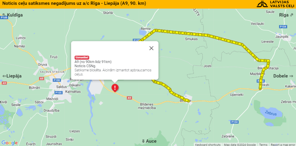 Negadījuma dēļ minētajā vietā ir pilnībā bloķēta satiksme pa Liepājas šoseju, un policija aicina iedzīvotājus izvēlēties citus apbraukšanas maršrutus, jo nav zināms, cik ilgu laiku aizņems negadījuma vietas sakopšana. Operatīvie dienesti turpina strādāt notikuma vietā.