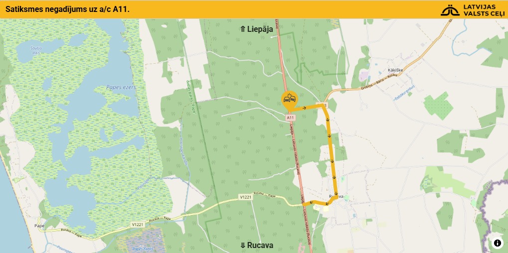 Valsts policijā saņemta informācija, ka uz autoceļa A11 Dienvidkurzemes novadā, Rucavas pagastā noticis ceļu satiksmes negadījums, kurā iesaistīts traktors un vieglais transportlīdzeklis. Operatīvie dienesti šobrīd strādā notikuma vietā. Satiksme ir pilnībā bloķēta, portālu “ReKurZeme” informē Valsts policijas Sabiedrisko attiecību nodaļas vecākā speciāliste Madara Šeršņova.