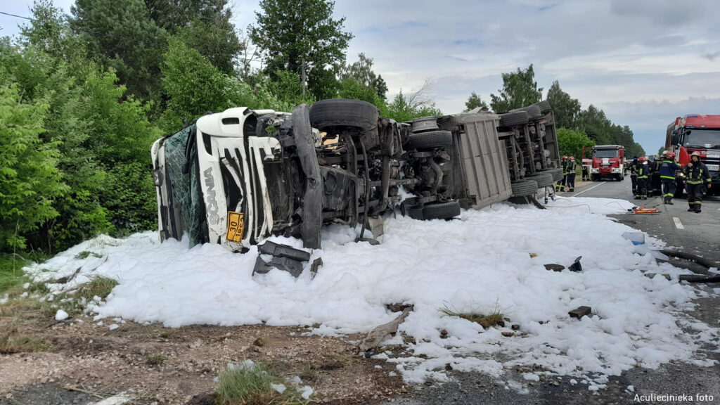Tā rezultātā vienā vieglajā automašīnā iespiesti vairāki cilvēki un no kravas automašīnas notiek degvielas noplūde.