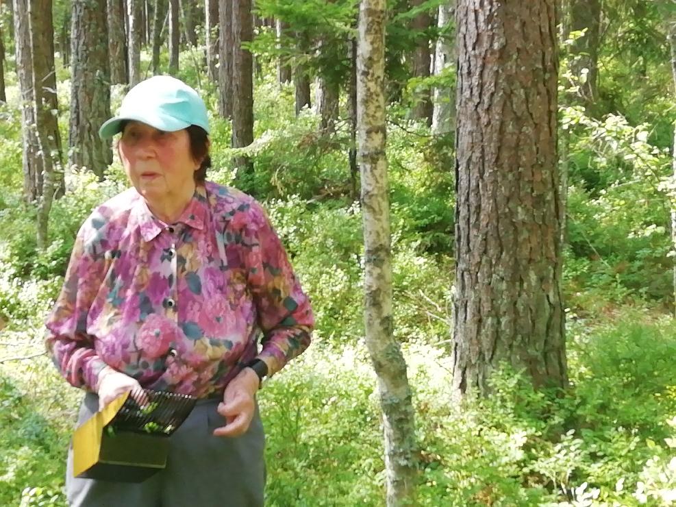 Sievietes apģērbs: gaiši zaļa jaka, gumijas zābaki – rozā/zili, parasti galvā lakats. Iespējams, līdzi ir grozs un mugursoma.
