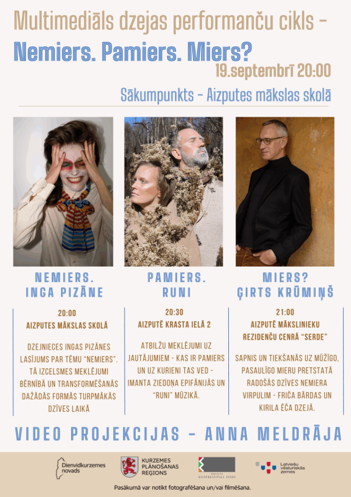 Piektdien, 19. septembrī pulksten 20 sākot no Aizputes mūzikas skolas norisināsies multimediāls trīs dzejas performanču cikls “Nemiers. Pamiers. Miers?”, atzīmējot ikgadējās “Dzejas dienas”, kas ir Latvijas Rakstnieku savienības organizēts pasākums ar dzejas lasījumiem un tikšanos ar autoriem, aicinot iepazīt ikvienam dzejas skaistumu, portālu “ReKurZeme” informē Dienvidkurzemes novada pašvaldības sabiedrisko attiecību speciāliste Ilze Elbere.