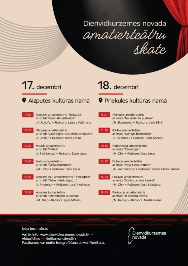 Latvijas Nacionālais kultūras centrs ik gadu rīko ne tikai koru, vokālo ansambļu, deju u.c., bet arī amatierteātra skates, lai noteiktu gada izrādi. Skate norisināsies trīs posmos. Pirmais posms ir novadu skate, kurā ekspertu komisija, kas iecelta saskaņā ar LNKC nolikumu teātra nozarē, noteiks labākās izrādes, kuras tālāk startēs reģiona skatē. Dienvidkurzemes novada amatierteātra kolektīvu sagatavotās izrādes vērtēs Latvijas amatieru teātru asociācijas (LATA) valdes priekšsēdētāja, Nīcas amatierteātra režisore Daina Kandevica un Liepājas jauniešu teātra studijas režisors Juris Ločmelis.