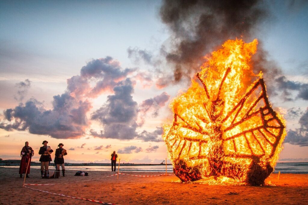 Pulksten 20.30 pludmalē pie mola skanēs “Rudra Beat” ritmi, tumšajā piekrastē iemirdzēsies mākslinieka Zigmunda Viļņa ugunsskulptūra ar šī gada tēmu “Metamorfoze”.
