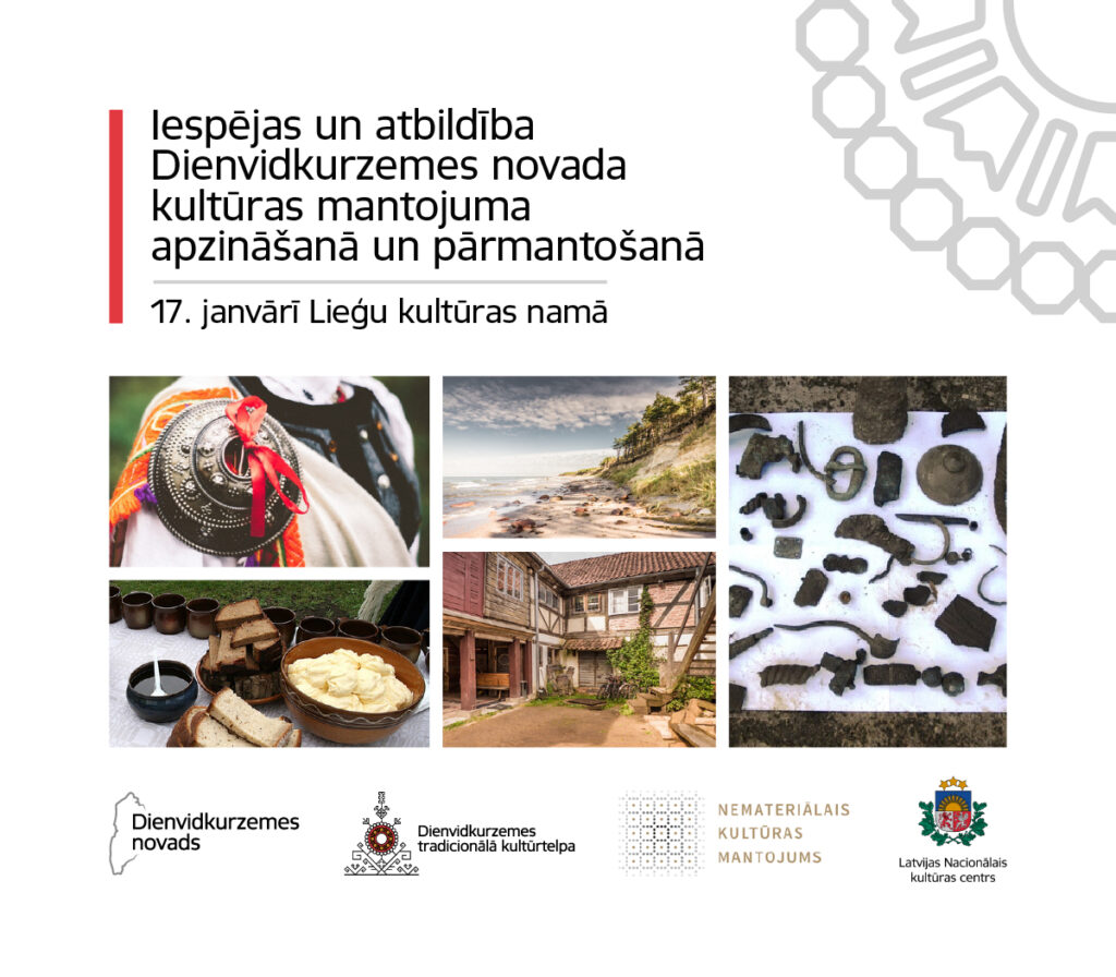 Dienvidkurzemes novada Tradīciju un folkloras centrs sadarbībā ar Latvijas Nacionālo kultūras centru 17. janvārī pulksten 10 aicina uz semināru “Iespējas un atbildība Dienvidkurzemes novada kultūras mantojuma apzināšanā un pārmantošanā” Lieģu kultūras namā. To apmeklēt aicināts ikviens, kam svarīga mūsu kultūras vērtību saglabāšana un nodošana nākamajām paaudzēm.