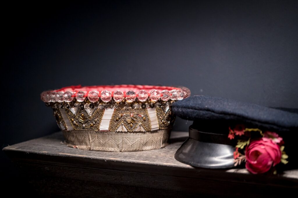 Publicitātes attēls no Liepājas muzeja ekspozīcijas “Dienvidkurzemes ļaudis, dzīve un darbs” – līgavas vainags un līgavaiņa cepure (foto: Kārlis Volkovskis).
