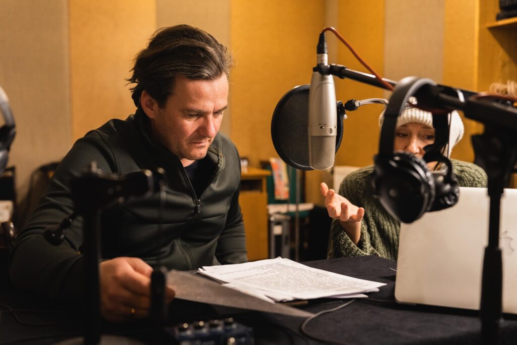 Šajā Liepājas Radio teātra iestudējumā piedalās Liepājas teātra aktieri – Madara Kalna, Kārlis Ērglis, Laura Jeruma, Mārtiņš Kalita, Madara Viļčuka, Leons Leščinskis, Armands Kaušelis (kurš fotogrāfijās iemūžina arī taošanas procesu), Aina Karele, Kārlis Artejevs, Inese Kučinska un režisors Dmitrijs Petrenko, bet galvenajās lomās dzirdēsiet ieraksta režisori Karīnu Tatarinovu un Dailes teātra aktieri Gintu Grāveli, kurš, piedaloties mūziklā „Purva bridējs ugunī”, kļuvis par mazu daļiņu no Liepājas teātra.
