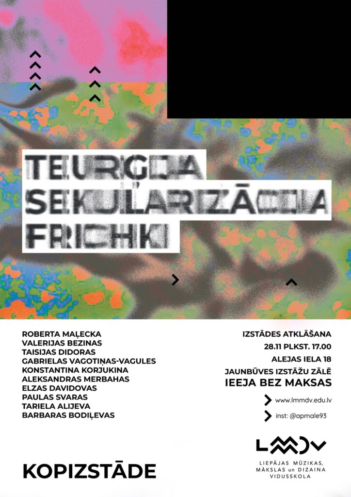 Liepājas Mūzikas, mākslas un dizaina vidusskolas (LMMDV) jaunbūves izstāžu zālē Alejas ielā 18 laika posmā no 28. novembra līdz 9. decembrim būs apskatāma jauno mākslinieku kustības “apmale93” radošo darbu izstāde “TEURĢIJA · SEKULARIZĀCIJA · FRICHKI”.