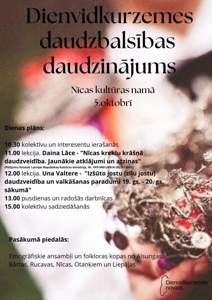 Turpinot iepazīt un iepazīstināt ar Dienvidkurzemes novada bagāto un daudzveidīgo kultūras mantojumu, 5. oktobrī no pulksten 11 Nīcas kultūras namā norisināsies “Dienvidkurzemes daudzbalsības daudzinājums”, kopā pulcējot novada un Liepājas etnogrāfiskos ansambļus un folkloras kopas, kā arī pasākumu papildinās izzinošas lekcijas.