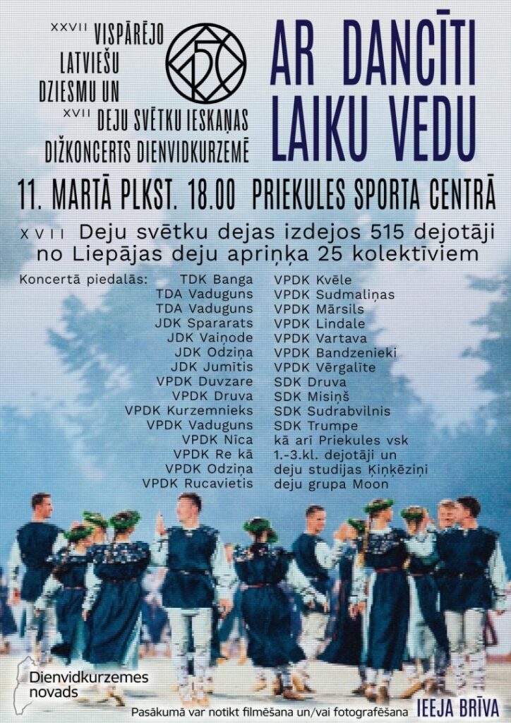 Sestdien, 11. martā, pulksten 18 Priekules sporta centrā sadejos tautas deju kolektīvi Dziesmu un deju svētku ieskaņas dižkoncertā “Ar dancīti laiku vedu”, kopā pulcējot vairāk kā 500 dejotājus.