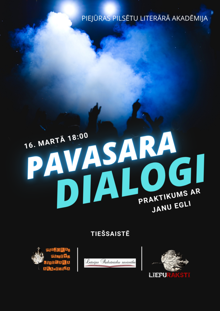 Piejūras pilsētu literārā akadēmija (PPLA) aicina uz tiešsaistes pasākumiem – trešdien, 16. martā, pulksten 18 praktiskā nodarbība “Pavasara dialogi” ar rakstnieci un dzejnieci Janu Egli un ceturtdien, 17. martā, pulksten 12 tikšanās “Iedvesma un profesionālās iemaņas” ar Aivaru Eipuru.