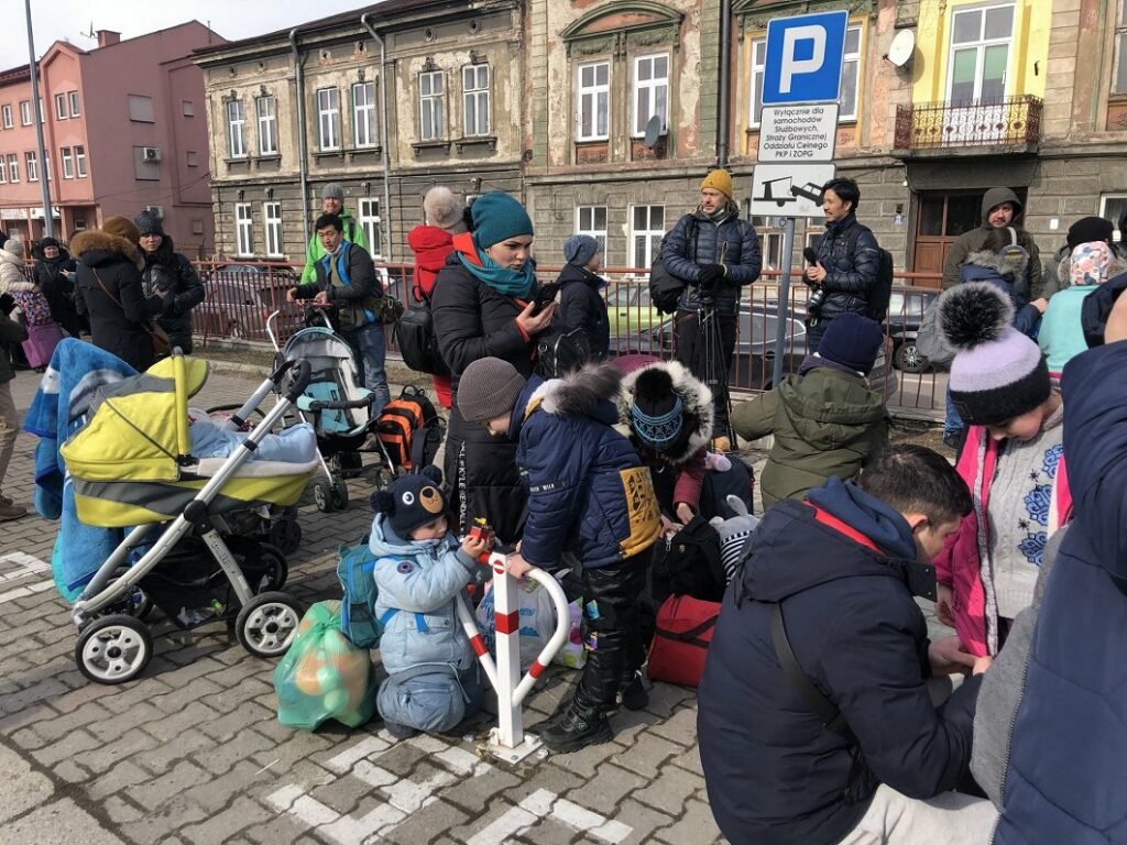 Ukrainas kara bēgļi uz Ukrainas-Slovākijas robežas 2022. gada martā. Foto: Linda Spundiņa/Latvijas Radio