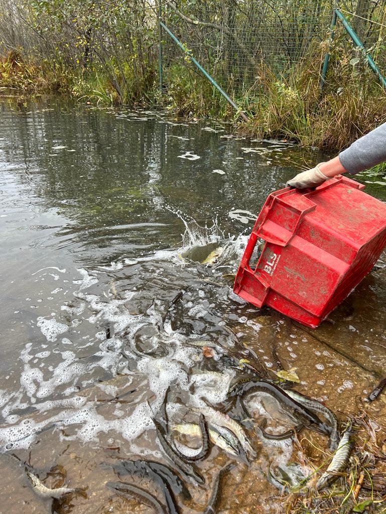 Lai papildinātu zivju populāciju, Bušnieku ezerā regulāri ielaiž vērtīgo zivju sugu mazuļus.