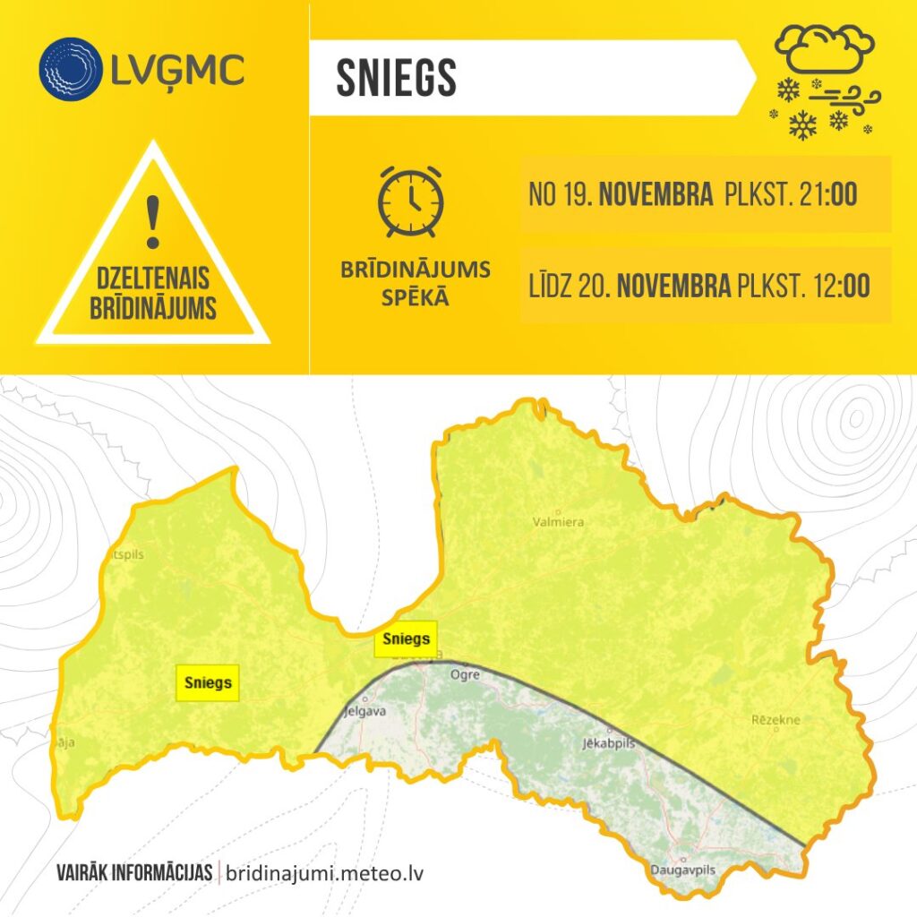 Latvijas Vides, ģeoloģijas un meteoroloģijas centrs izsludinājis dzeltenās pakāpes brīdinājumu par gaidāmu sniegu, slapju sniegu un puteni, 20. novembrī no rīta daudzviet valstī būs izveidojusies 5-8 centimetrus bieza sniega kārta. Brīdinājums nebūs spēkā daļā dienvidaustrumu novadu, kur galvenokārt gaidāms lietus, vēsta LETA.