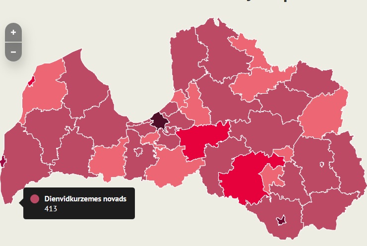 Viszemākā saslimstība savukārt ir Bauskas novadā – 684,9 gadījumi uz 100 000 iedzīvotāju.