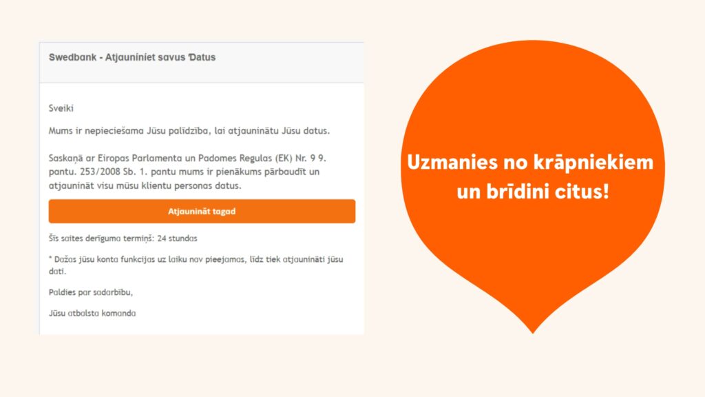 “Swedbank” atgādina – banka nekad nesūtīs aicinājumu atjaunot personas datus e-pastā. Ja būs šāda nepieciešamība, tad banka saziņu ar klientu veiks internetbankā, kurā arī būs iespēja šos datus ievadīt.