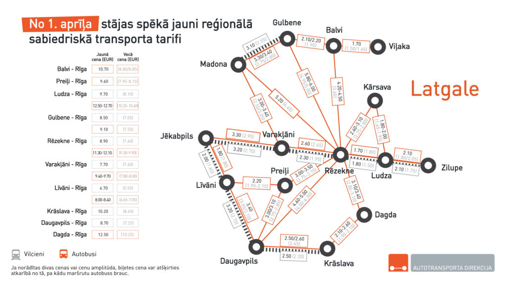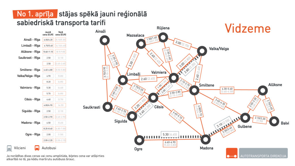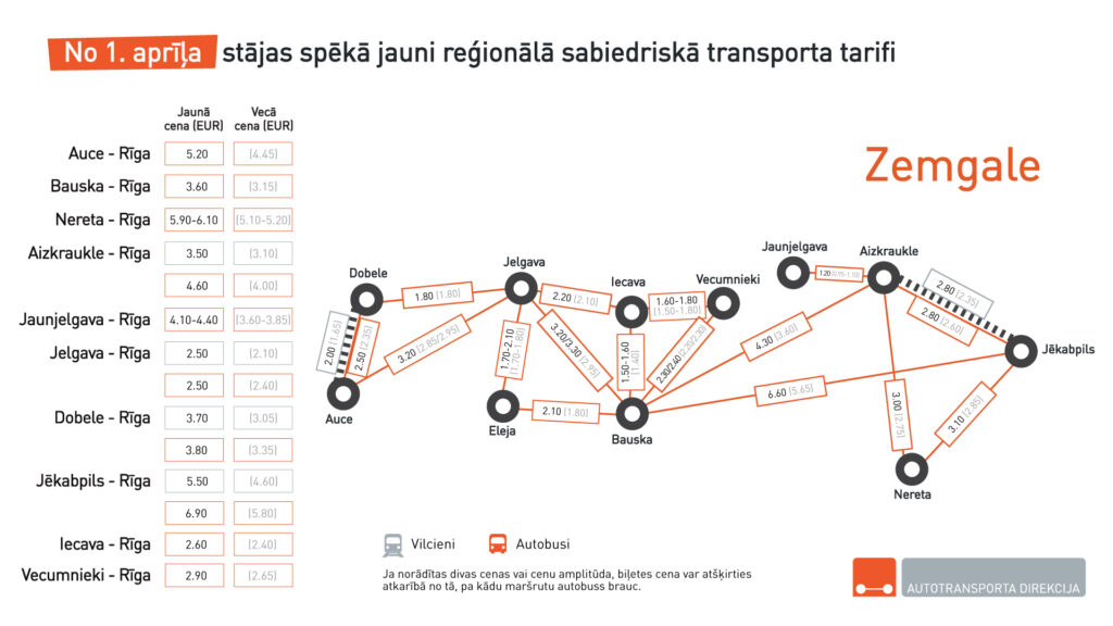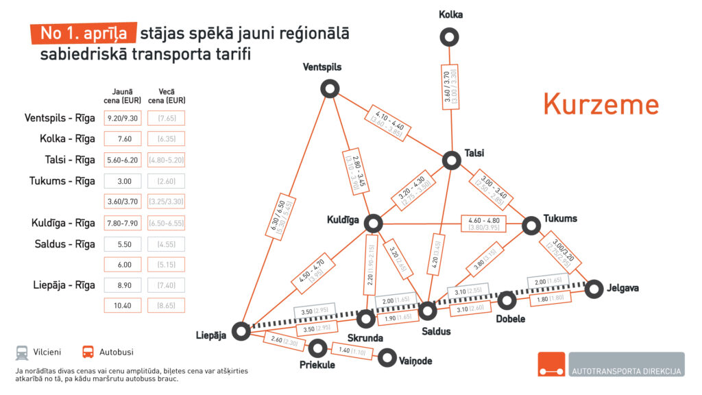 ATD skaidroja, ka maksa par braucienu ar vilcienu maršrutā Rīga-Liepāja iepriekš bija 7,4 eiro, bet turpmāk tā būs 8,9 eiro, kamēr maksa par braucienu ar autobusu šajā maršrutā bija 8,65 eiro, bet turpmāk tā būs 10,4 eiro.