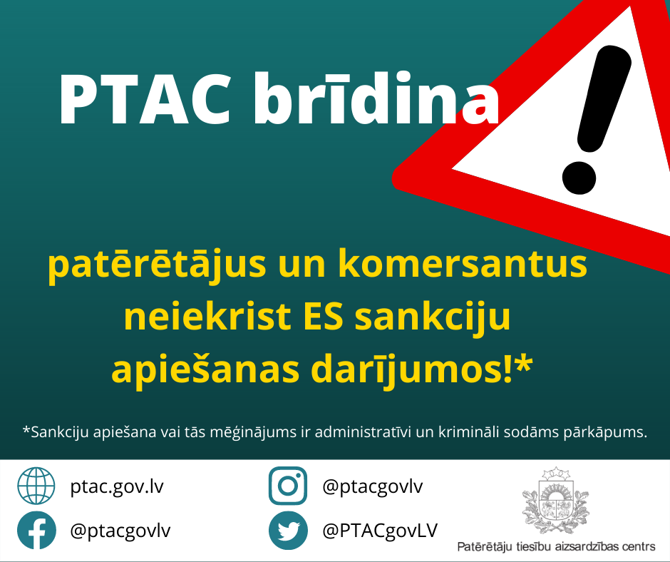PTAC aicina ievērot Sankciju likumā noteiktos ierobežojumus un gadījumā, ja pēkšņi pakalpojumu sniedzējam vai pārdevējam vairs nevar veikt maksājumus, izmantojot līdz šim izmantotos maksājumu līdzekļus, pievērst pastiprinātu uzmanību, vai konkrētā juridiskā persona nav ar sankciju subjektu saistīta persona, kuras kontus nav iesaldējušas kredītiestādes. Šādi aizdomīgi gadījumi varētu būt aicinājumi izmantot dažādas ārvalstu maksājumu sistēmas vai platformas (PayPal, WePay, Skrill, Intuit u.c.) vai citus instrumentus, ar ko iespējams nodot finanšu vai tiem pielīdzināmas vērtības, piemēram, kriptovalūtas (Bitcoin, Etherium, Cardano u.c.).