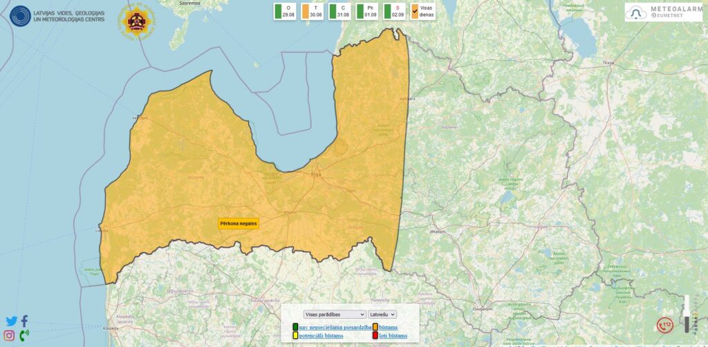 Negaisa mākoņi iespējami visā valstī un visas diennakts garumā, bet lielākais stihijas risks prognozēts Latvijas austrumu daļā, sākot ar trešdienas pēcpusdienu. Stipras lietusgāzes var izraisīt īslaicīgus plūdus, vēja ātrums brāzmās var sasniegt 30 metrus sekundē, iespējami virpuļviesuļi un lielāko krusas gabalu diametrs var pārsniegt piecus centimetrus, vēsta LETA.