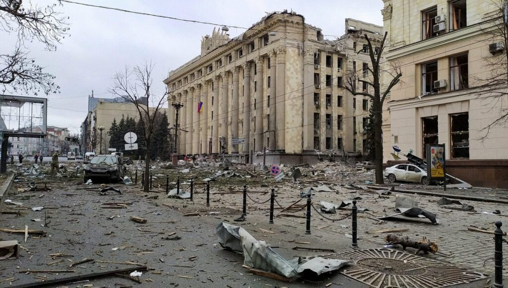 Kara postījumi Harkivas centrā. 2022. gada 1. marts. Foto: AFP, SERGEY BOBOK
