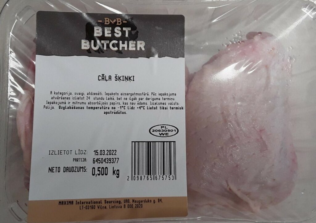 - Cāļa šķiņķi “Best Butcher” (PL 20630501 WE), derīguma termiņš – 15.03.2022., partija nr. 6450439377; izplatītājs – Maxima International Sourcing, UAB;