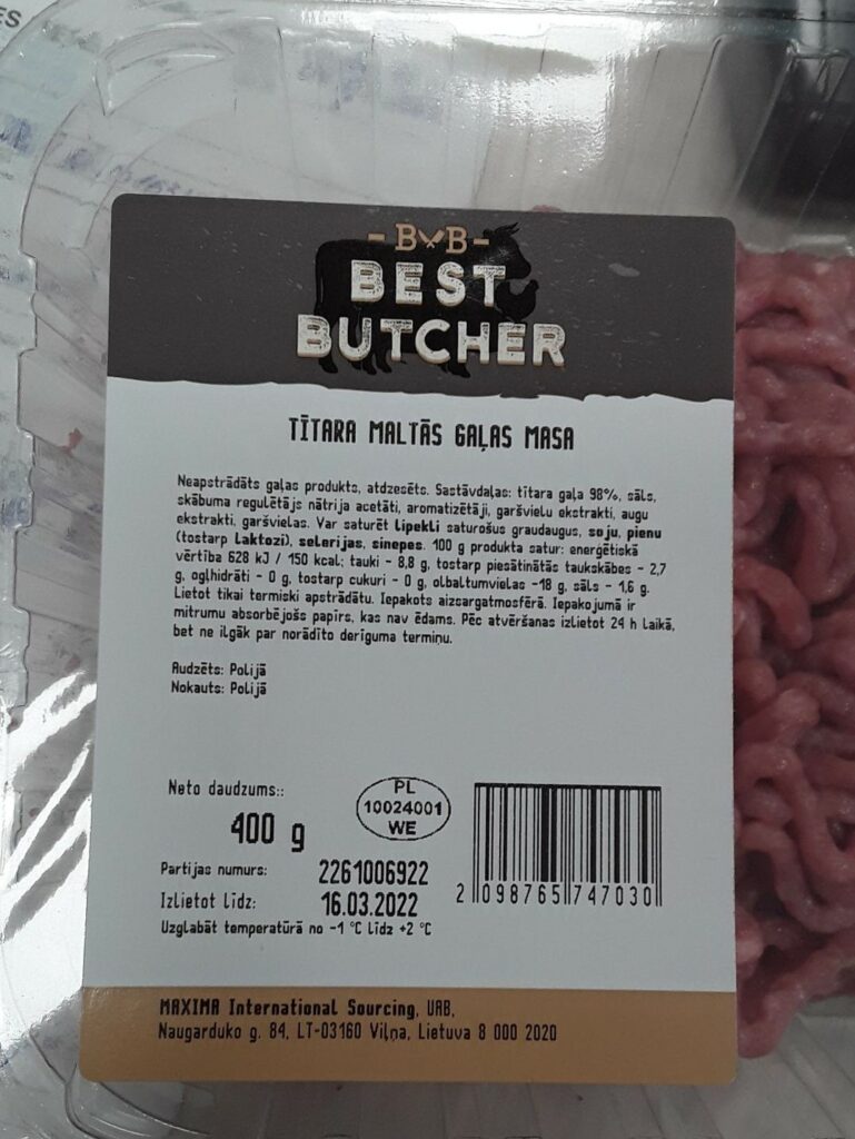 - Tītara maltās gaļas masa “Best Butcher” (PL 10024001 WE) – derīguma termiņš – 16.03.2022., partija nr. 2261006922, izplatītājs – Maxima International Sourcing, UAB.