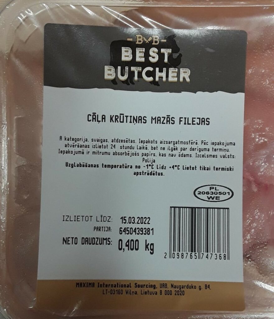 - Cāļa krūtiņas mazās filejas “Best Butcher” (PL 20630501 WE), derīguma termiņš – 15.03.2022., partija nr. 6450439381, izplatītājs – Maxima International Sourcing, UAB;