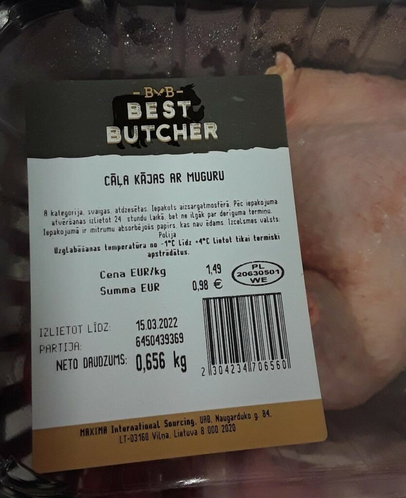 - Cāļa kājas ar muguru “Best Butcher” (PL 20630501 WE), derīguma termiņš – 15.03.2022., partija nr. 6450439369, izplatītājs – Maxima International Sourcing, UAB;