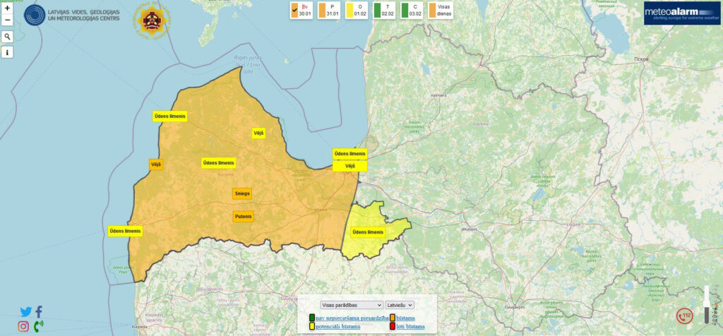 Liepājā, Ventspilī un Rīgā saistībā ar ūdens līmeņa kāpumu jūrā spēkā dzeltenais brīdinājums, ūdens līmenis gaidāms aptuveni metru virs normas.