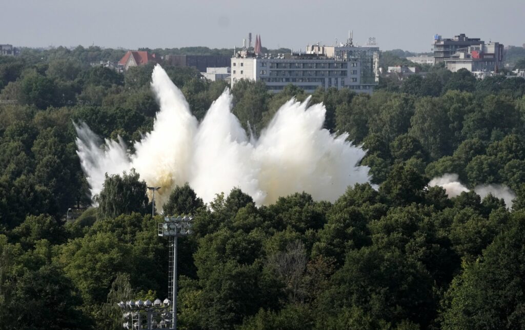 Obelisks tika nogāzts pēc aptuveni septiņas stundas ilga darba, krītot izraisot skaļu blīkšķi un augstas ūdens šļakatas no blakus esošā baseina. Sanākušie vērotāji padomju armijai veltītā obeliska krišanu sagaidīja ar ovācijām, vēsta LETA.