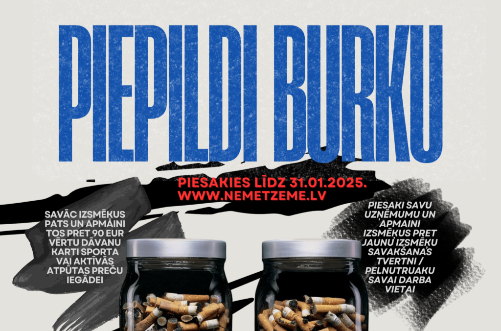 Lai mazinātu vidē nonākušo cigarešu izsmēķu daudzumu un sekmētu sabiedrības izpratnes veidošanu par pareizas cigarešu izsmēķu utilizācijas nozīmi, biedrība “Latvijas Atkritumu saimniecības uzņēmumu asociācija” izsludina nebijušu vides ilgtspējas konkursu “Piepildi burku”. Konkursa dalībniekus aicina piepildīt tukšu burku ar cigarešu izsmēķiem, tādējādi parūpējoties, lai tie nenonāk vidē, un apmainīt savāktos izsmēķus pret garantētu vērtīgu balvu.