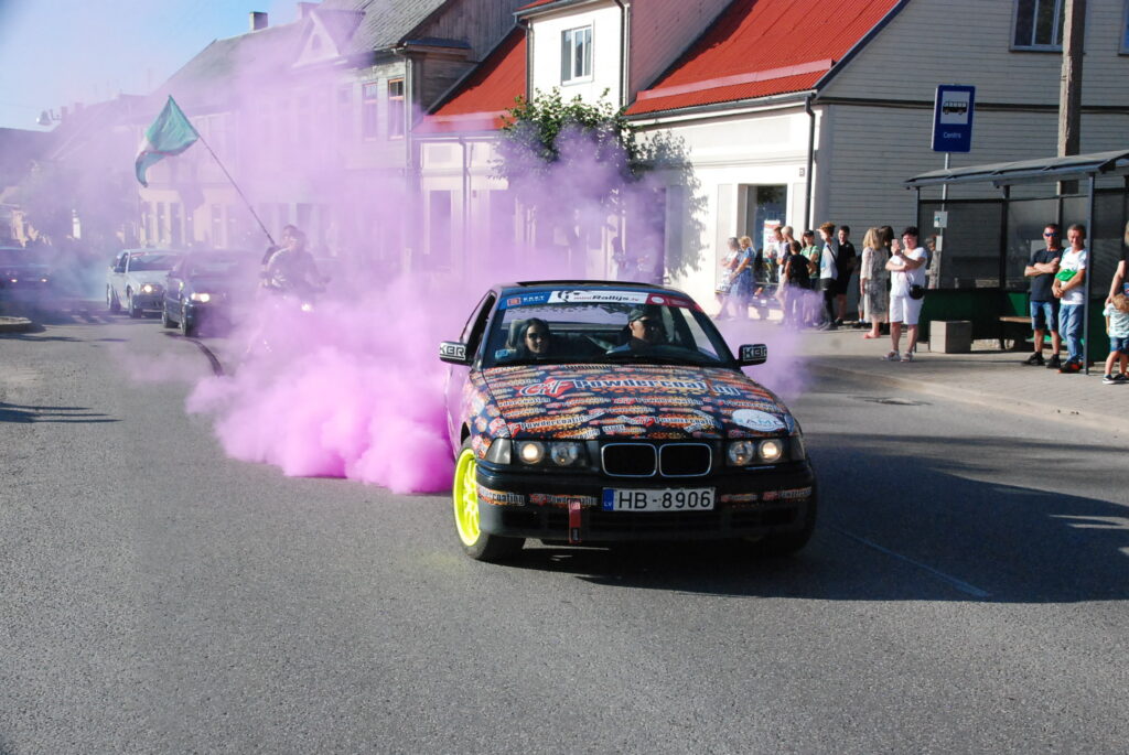 Aizputes pilsētas svētku gājienā brauc Aizputes autosportists Gvido Rozenblūms. Foto – Uldis Dobelis