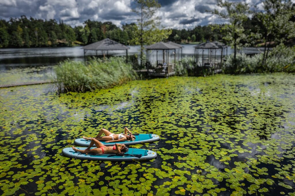 Jau vairākus gadus blakus veikparkam un kafejnīcai (kas, starp citu, piedāvā īpaši izmeklētu ēdienkarti un plašu atspirdzinājumu klāstu) tuvus un tālus viesus uzņem “BB camping”. Kempinga teritorija ir ļoti plaša un skaistajā dabas parkā naktis piedāvā pavadīt gan bungalow mājiņās un īpaši treileru vajadzībām aprīkotās stāvvietās, gan teltīs un hamokos, jeb nakšņošanai paredzētos šūpuļtīklos. Ar Liepājas pašvaldības atbalstu ir tapis arī ekskluzīvs glempings. Tās ir divas glempinga mājiņas uz ūdens, kurp aizkļūt var, braucot ar laivu. Ja jautāsiet – kas ir glempings? Tad īsi raksturojot – tas ir mūsdienīgi labiekārtots un mājīgs telts namiņš.